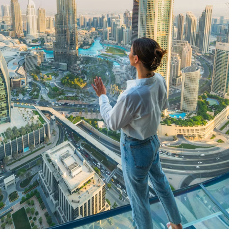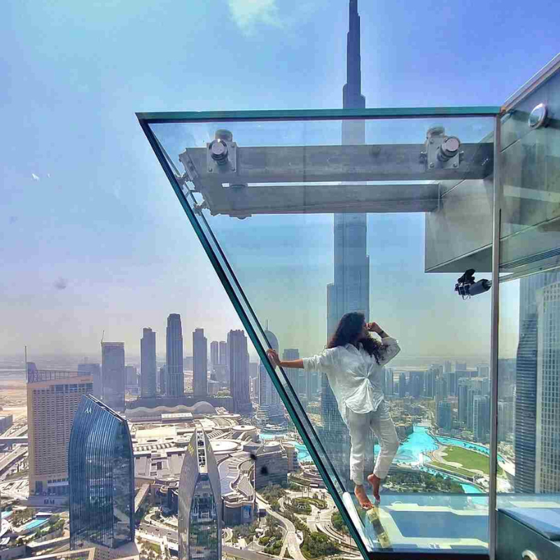 Visitors can step onto the stunning glass floor and admire breathtaking sights of the city skyline, including the iconic Burj Khalifa.